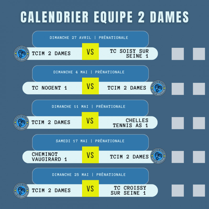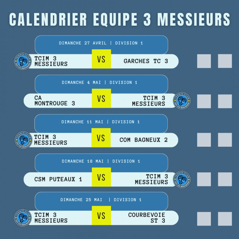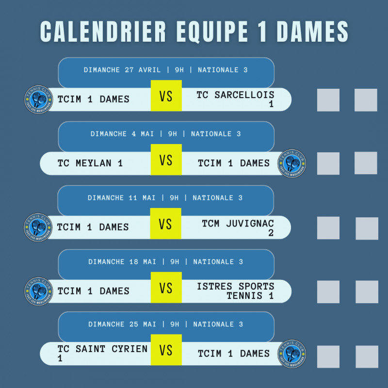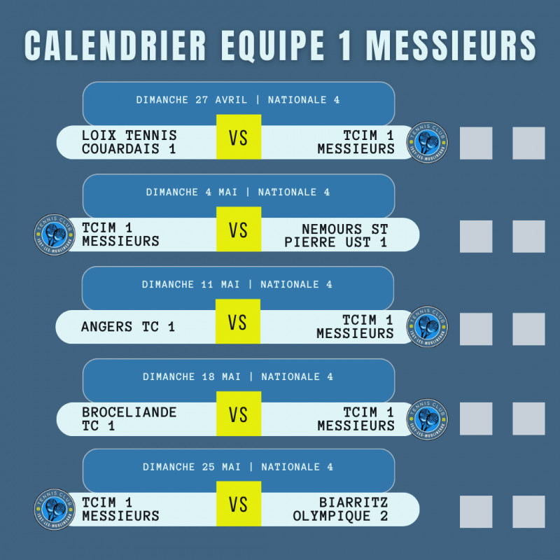 Le calendrier complet des matchs par équipes seniors au TCIM 🗓️